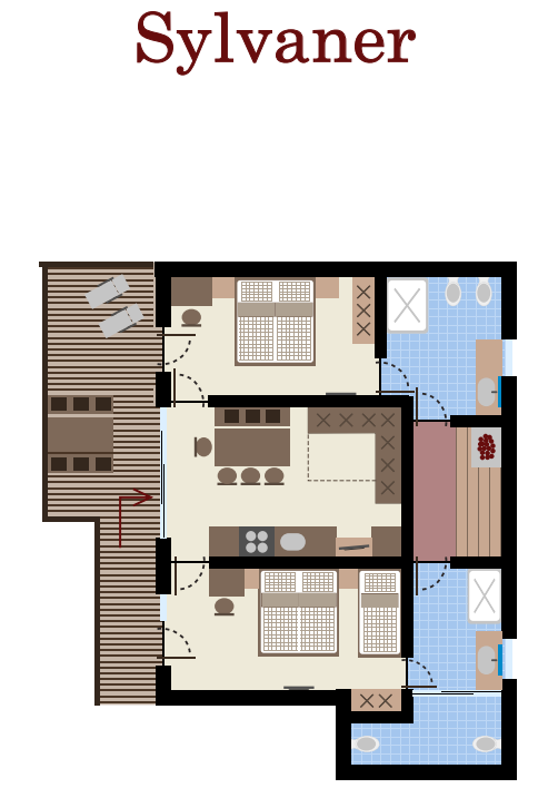 Helle Räume, Panorama-Terrasse und das Highlight: Eine private Sauna direkt in der Wohnung. Mit zwei Zirben-Schlafzimmern und eigenen Bädern bietet die „Sylvaner“ exklusiven Komfort für Familien und Freunde.